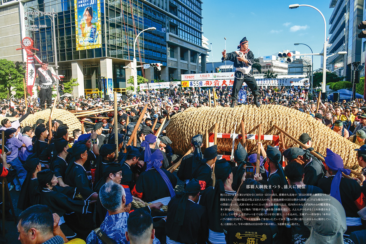 文化の秋、スポーツの秋…10月は各地でさまざまな祭典が行われ、人々の歓喜が交差した。第55回那覇大綱挽まつりでは500有余年の歴史上初の女性綱方が誕生。夏の甲子園で初優勝を飾った沖縄尚学高校野球部には県民栄誉賞が授与された。大阪・関西万博の沖縄スペシャルイベント、神戸・新長田琉球祭、エイサー団体「大正琉球会」が試合前に演舞したB1リーグの大阪エヴェッサ開幕戦など、県内外の「秋の祭典」を特集した。